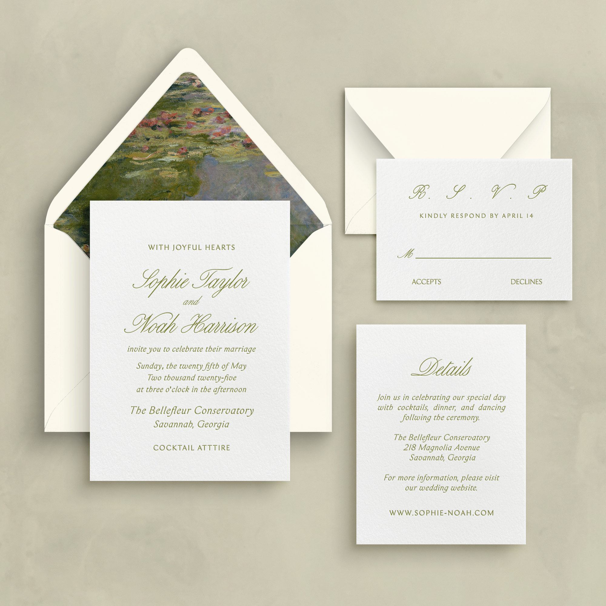 Each of our semi-custom suites begin with a thoughtfully designed foundation, and can be tailored to reflect the elegance of your celebration. Customize your suite by selecting from curated color palettes, luxurious paper stocks, refined print methods, and a selection of curation embellishments to tie everything together.